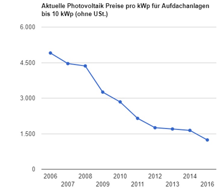 Danach stagnierte es bis hin zum Jahr 2016 waren es nur noch 1400€/kWp. Also eine Preisverfall in 4 Jahren um nur noch 350€/kWp